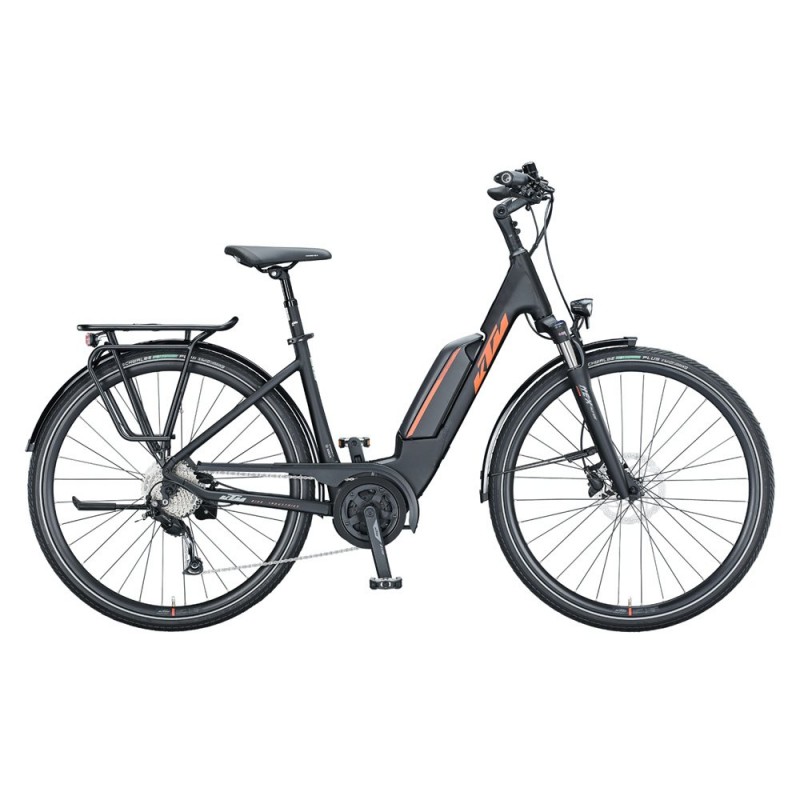 Le vélo électrique KTM Macina Fun 510 (ici en version cadre ouvert) est doté d'un moteur au pédalier Bosch Active +, avec batterie Bosch PowerPack (500Wh) semi-intégrée au cadre.
