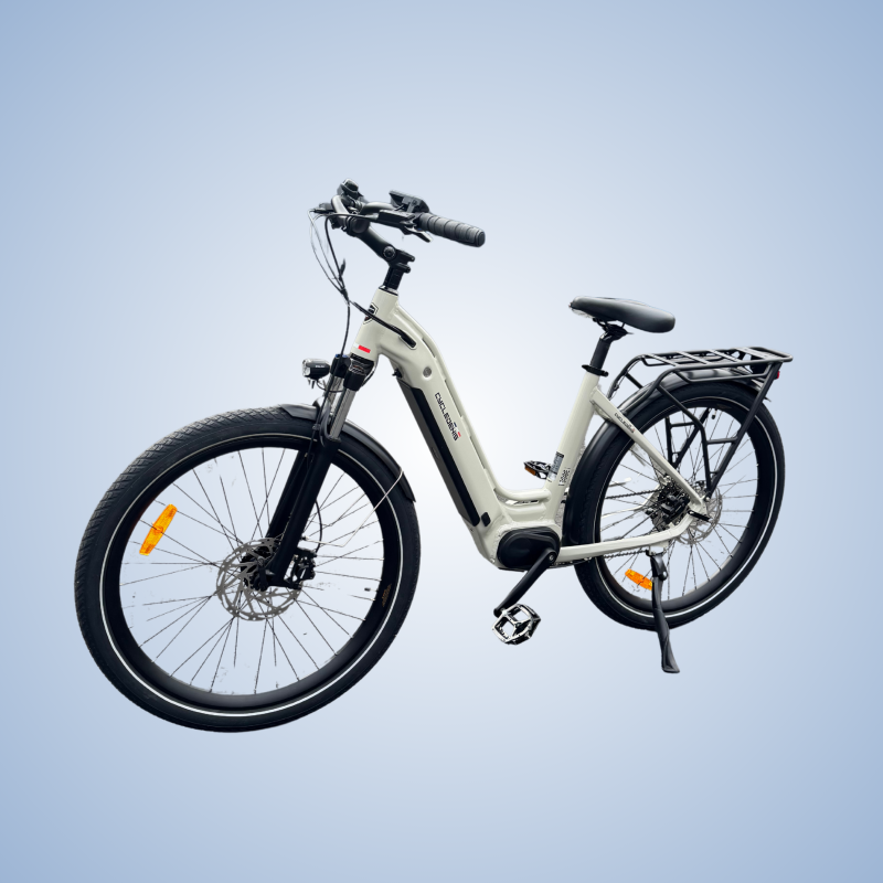 Grâce à son cadre trapèze en aluminium robuste et son design soigné, ce VAE assure une conduite fluide et équilibrée. Sa transmission Shimano 8 vitesses, ses freins à disques hydrauliques 160 mm et sa console digitale intuitivegarantissent un confort et une sécurité optimaux sur tous les trajets.